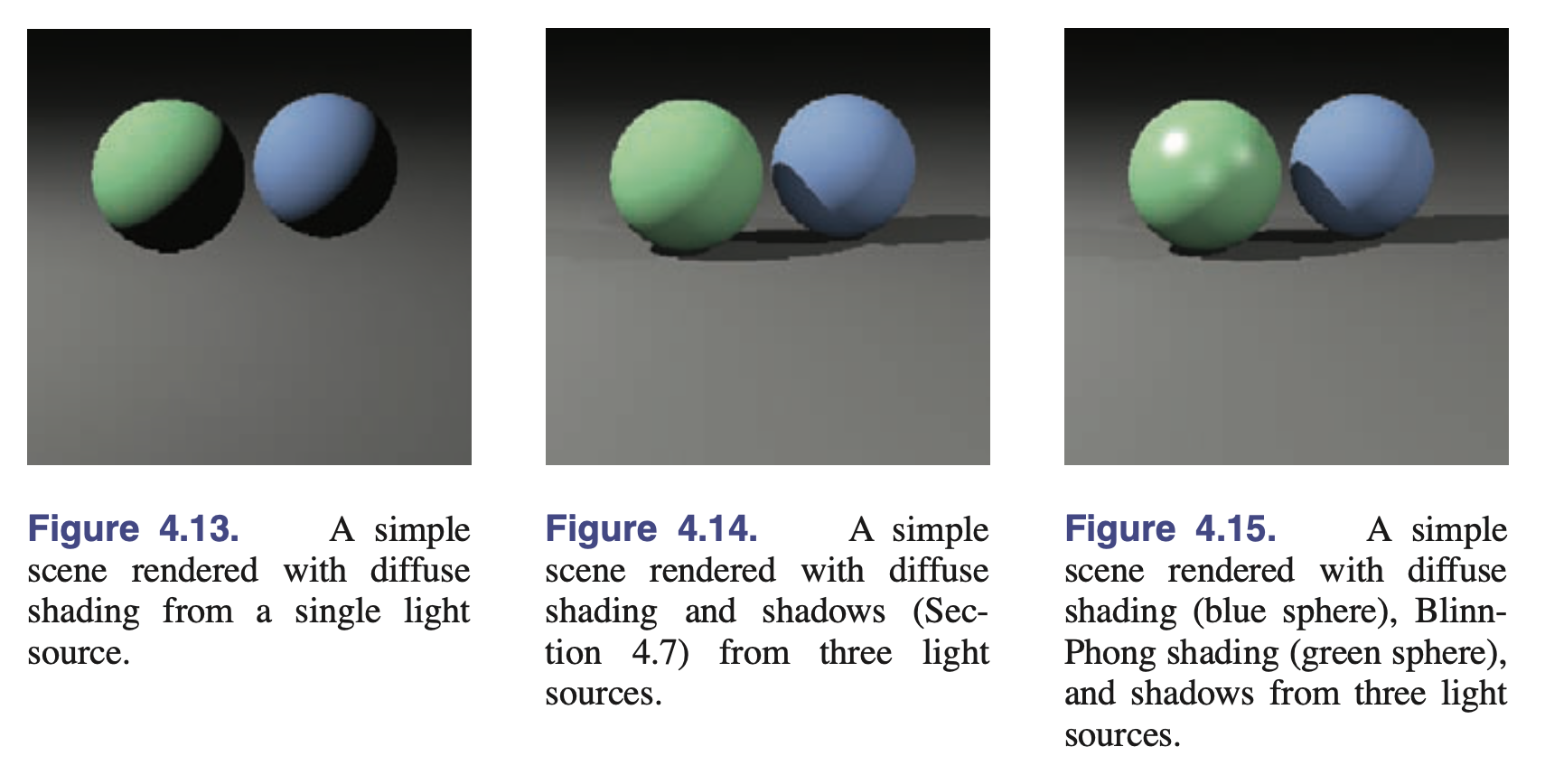- 在 Lambertian Shading 的基础上加入镜面部分(specular component),前者成为漫反射部分(diffuse component)。