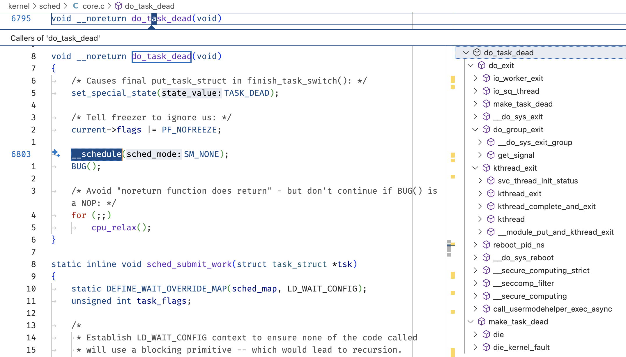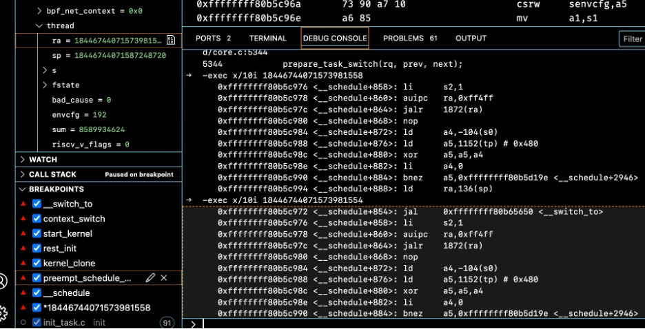 这次 switch 成功了,进入了 kernel_init,而它 wait_for_completion 又再次从 schedule_timeout() 进入 schedule(),并切换回 init_task。检查其 thread.ra 发现是 __schedule() 中__switch_to 后返回的地方,可以看出是从 __schedule() 原路返回的