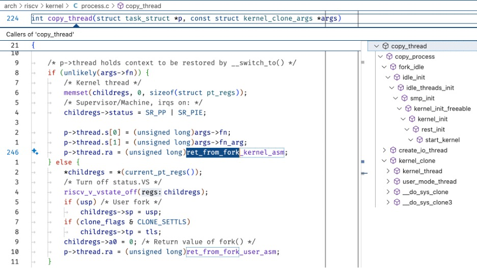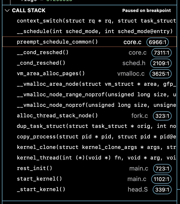 最后这一次调度进入 kthreadd(2),它很快进入了 trap handler。通过 sepc 回溯发现调用链如下: